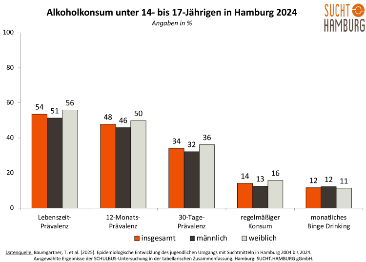 Die aktuellen Ergebnisse des Epidemiologischen Suchtsurvey (ESA) des Instituts für Therapieforschung (IFT) ergeben, dass 20,4% der männlichen und 23,0% der weiblichen Alkoholkonsumentinnen in Hamburg einen riskanten Alkoholkonsum (mehr als 12 g/Frauen bzw. 24 g/Männer Reinalkohol pro Tag) betreiben. Binge-Drinking (fünf oder mehr alkoholische Getränke bei einer Trinkgelegenheit) wird darüber hinaus von 40,8 % der männlichen und 22,1 % der weiblichen Konsumentinnen berichtet. Die Verbreitung des Alkoholkonsums ist in den letzten Jahren signifikant rückläufig.
