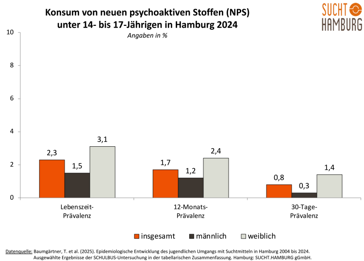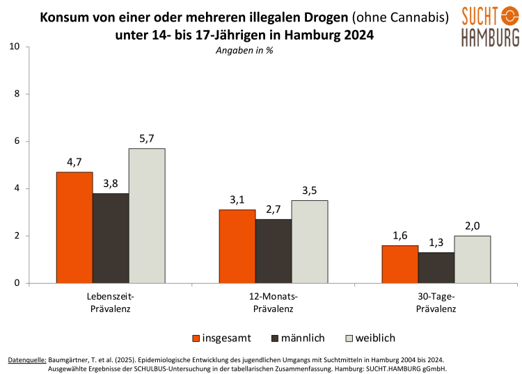 Von den befragten Hamburger*innen haben in den letzten zwölf Monaten insgesamt 12% Substanzen wie Amphetamine / Methamphetamine, Ecstasy, LSD, Heroin/andere Opiate, oder Kokain/Crack sowie 1,3% neue psychoaktive Stoffe (NPS) konsumiert. Im Vergleich zu Cannabis spielen andere illegale Drogen somit eine untergeordnete Rolle.