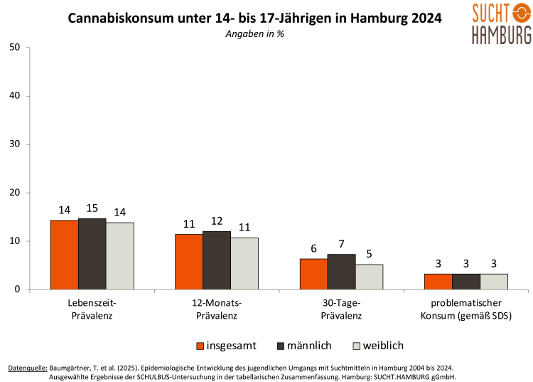 10,5% der Hamburger*innen haben in den letzten zwölf Monaten Cannabis konsumiert (Männer: 11.7 %, Frauen: 9.2 %). 2,9% der Hamburger*innen weisen einen klinisch relevanten Cannabiskonsum nach Severety of Dependence Scale (SDS) auf.
