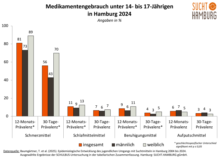 Über 74% der Hamburger*innen haben in den letzten zwölf Monaten mindestens einmal ein Schmerzmittel eingenommen (65,4% Männer vs. 82,9% Frauen). Der Gebrauch von Schlaf- oder Beruhigungsmitteln ist bei 7% der Hamburger Bevölkerung verbreitet (3,4% Männer, 10,6% Frauen), 1,3% gaben an, Anregungsmittel eingenommen zu haben (Männer 2,1%, Frauen 0,5%). Ein problematischer Medikamentengebrauch konnte die Studie bei 11,6% der Hamburgerinnen und 3,5% der Hamburger (insgesamt 7,4%) feststellen.